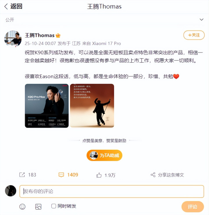 还有人说:“必须支持滕总在小米的最后一款巨作”,“腾哥冲你这话我支持一台”。