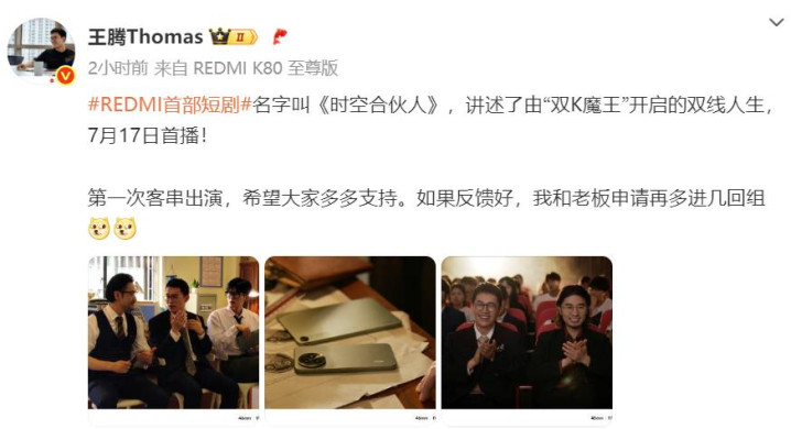 然而更让人意外的是,王腾还“跨界”参演了小米的短剧《时空合伙人》。