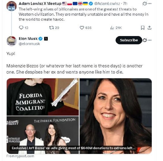 马斯克回应称:“是的!麦肯齐·贝索斯(或者不管她现在姓什么)是另一个例子。她鄙视她的前任,并希望任何像他这样的人去死。”
